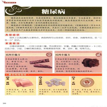 糖尿病:糖尿病是由遗传因素、免疫功能紊乱、微生物感染及其毒素、自由基毒素、精神因素等等各种致病因子作用于机体导致胰岛功能减退、胰岛素抵抗等而引发的糖、蛋白质、脂肪、水和电解质等一系列代谢紊乱综合征。糖尿病分1型糖尿病、2型糖尿病及其他特殊类型的糖尿病。1型糖尿病是一种自体免疫疾病。2型糖尿病是成人发病型糖尿病,多在35~40岁之后发病,占糖尿病患者90上。患者体内产生胰岛素的能力并非完全丧失,而是一种相对缺乏的状态。 典型症状:临床上以高血糖为主要特点,典型病例可出现多尿、多饮、多食、消瘦等表现,即“三多一少”症状。 家庭防治:注意进食规律,一日至少进食三餐,而且要定时、定量,两餐之间要间隔4~5小时;应选少油、少盐、少糖的清淡食品,菜肴烹调多用蒸、煮、凉拌、涮、炖等方法。 |