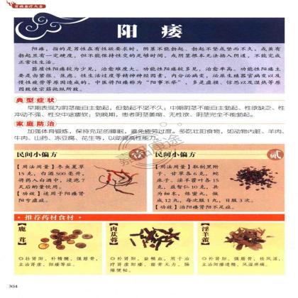 阳痿,指的是男性在有性欲要求时,阴茎不能勃起、勃起不坚或坚而不久,或虽有勃起且有一定硬度,但不能保持性交的足够时间,或阴茎根本无法插入阴道,不能完成正常性生活。器质性阳痿较为少见,治愈难度大。功能性阳痿较多见,治愈率高。功能性阳痿主要是由紧张、焦虑、性生活过度等精神神经因素,内分泌病变,泌尿生殖器官病变以及慢性疲劳等原因造成的。中医将阳痿称为“阳事不举”,多是虚损、惊恐以及湿热等原 因致使宗筋弛纵所致。 【功效】适用于阳痿肾阳亏虚症。 ·推荐药材食材·【鹿茸】◎壮肾阳、补精髓、强筋骨,主治肾虚、阳痿等症。 典型症状 家庭防治:加强体育锻炼,保持充足的睡眠,避免疲劳过度。多吃壮阳食物,如动物内脏、羊肉、牛肉、山药、冻豆腐、花生等,以助提高性能力。 上一篇【早泄】食疗食谱下一篇【女性更年期综合征】食疗食谱 |