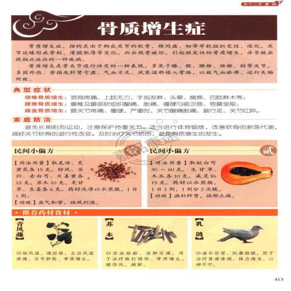 骨质增生症:骨质增生症,指的是由于构成关节的软骨、椎间盘、韧带等软组织变性、退化,关节边缘形成骨刺,滑膜肥厚等变化,而出现骨破坏,引起继发性的骨质增生,并导致出现相应症状的一种疾病。 骨质增生是骨关节退行性变的一种表现,多见于膝、髋、腰椎、颈椎、肘等关节,多因外伤、劳损或肝肾亏虚、气血不足、风寒湿邪侵入骨络,以致气血瘀滞、运行失畅所致。 典型症状:颈椎骨质增生:颈背疼痛、上肢无力、手指发麻、头晕、瘫痪、四肢麻木等;腰椎骨质增生:腰椎及腰部软组织酸痛、胀痛、僵硬与疲乏感、弯腰受限;膝盖骨质增生:膝关节疼痛、僵硬,严重时,关节酸痛胀痛、跛行走、关节红肿。 家庭防治:避免长期剧烈运动,注意保护持重关节。适当进行体育锻炼,改善软骨的新陈代谢,减轻关节软骨的退行性改变。及时治疗关节损伤,避免骨质增生的发生。 推荐药材食材:【青风藤】 【苏木】 【乳鸽】补骨脂芡实鸭汤,玉竹西洋参茶,海带豆腐汤 上一篇【心律失常】食疗食谱下一篇【颈椎病】食疗食谱 |