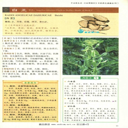 《本草纲目》记载白芷:“治鼻渊、鼻衄,齿痛,眉棱骨痛,大肠风秘,小便出血,妇人血风眩晕,翻胃吐食,解砒毒、蛇伤,刀箭金疮。”
