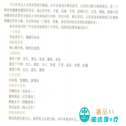 手诊医学论:手诊医学以人文哲学思想为基础,以中医基础为理论指导,以西医诊断为辨病原则,是一门 综合性健康保健预防医学。 通过对手形、甲象、指象、手背、脏腑区位、主线、辅线、脏腑分段 的颜色形态变化与彼此之间的关系进行判断、综合分析、辨证求因,从而全面系统地制订出健康 保健治疗的方案。 手诊医学是一门易学、易懂、易研究的综合性预防保健医学。 本书总结归纳了手诊医学体系的十大特征,现简明扼要地阐述如下: 一个宗旨: 手诊济天下,健康创未来! 两种哲学观: 唯心辨万物,唯物定规律。 三望诊断: 望色十纲:浮沉、清浊、浅深、聚散、荣枯 望态十六纲:凹凸、硬软、大小、胖瘦、干湿、温凉、快慢、抖僵 望势六纲:远近、虚实、真假 三大主线: 生命线、智慧线、感情线 四条学习法则: 宁精勿杂(目标专一) 循序渐进(记忆原则) 熟能生巧(理解感悟) 灵活运用(得心应手) 四条诊断原则: 类似而多见者为主,典型而少见者为辅,异乎寻常者不忘,形似类异者求证。 四条辨证定理: 叠加定理(诊症定理)、渐减定理(康复定理)、判定定理(求本定理)、三因定理(辨 因定理) 五种类别: 五脏:心肝脾肺肾 五色:红青黄白黑 五行:火木土金水 五指:拇食中无小 五纹:+×O□△ ; 六大平衡理论: 营养平衡(日常生活):人的日常饮食对身体造成的健康平衡。 免疫平衡(体质因素):人体总的抗病能力。与体质有关,一种自发的原始本能状态。 阴阳平衡(中医辨证):反映人体动态的健康平衡,中医的养生观。 健康平衡(亚健康状态):人体很多系统或脏器出现了亚健康状态,但却保持此种状态而 不发病,维持了暂时的亚健康平衡状态。 疾病平衡(疾病状态):身体的各个脏器都有临床之症,互相影响、制约,构成疾病综合 征,人体处于一种暂时的疾病平衡状态。每一种疾病都可导致其死亡,但事实上,患者却出奇 地活着。所以这是一种动态的平衡观。 心理平衡(心理状态):因感情、语言、行动、思想、精神紧张、心理压力等产生的疾病, 如高血压等病。由于忧郁、沉闷、焦虑、烦躁、心理压力过大等,该病会久治不愈,并且缠绵顽 固,易发生其他病变。所以不仅要拥有健康的生理,还要有健康的心理,乐观是最好的药方。 七项人文特征: 性格、年龄、生理、心理、社会、自然、教育 八条辅线: 人生线、健康线、性线、生育线、心线、脑线、手颈线、离火环 九大区位: 震区、巽区、离区、坤区、兑区、乾区、坎区、艮区、明堂区 十大病线: 乾生线、性能线、过渡线、桥贯线、手术线、艮震分界线、肝胆线、小离环、梦幻线、早熟线 .手诊中医论 : 原始手诊的起源早于中医,中医学的蓬勃发展为手诊的发展奠定了理论基础。手诊的发展 被认为是中医望诊的延伸与进步,手诊推动了中医学的普及与发展。 学习研究手诊,只有具备一定的中医基础知识,方能知道手诊的来龙去脉。从历史来看, 手诊的起源早于中医,只不过当时人们限于条件,没有对此进行系统的整理:随着中医的发展, 手诊医学也随之进步,经验积累日渐增多;与此同时,手相学也蓬勃发展,结果两者常被混为一 谈,使手诊被蒙上了一层神秘的面纱;近代与现代,随着社会的稳定与科技的发达,又有了更多 人参与研究手诊。手诊的现代研究与大量的临床事实,推动了中医诊断学的发展进程,并指导了 中医养生产业的可持续发展。 第一章 手诊导论 一、手诊的起源早于中医 在原始时代,危险与饥饿始终威胁着人类的生存与发展,人类不得不利用与动物最明显的 区别之-——手,不断地与大自然搏斗,使自身生命得以维持与发展,此时,人类已经本能地 意识到手在生命中的重要意义。可以说,如果原始人没有手,就是到现代,人类还是和四足兽 一样,没有什么区别。 原始社会的人类在无可奈何的自然条件下,他们用手象征性地做出各种动作,来祈求和保 佑自身和人类的生命安全。通过手的不同运动变化规律和手与大自然物质的亲密接触,产生了 原始的手文化,比如原始的舞蹈、手语、手势。在此过程中,人类逐渐积累了对手的理解与认 识,这或许是人类最为本能的、最为原始的、最为人文的、最为基础的手诊了。 在当时,并没有阴阳五行、脏腑理论渗透其中,也没有原始的图腾崇拜文化出现,更没有 神巫的诞生,更谈不上医巫文化的同源现象。实际上,这是人类更注重手与人类生活息息相关 的规律性现象的总结,为什么手相学在人们心目中的应验率较高、老幼皆知?这也是一个重要 原因。 从医巫文化同源时代开始,手或多或少开始渗入了易经、神学、阴阳五行等思想,可惜的 是,当时人类并没有意识到手在健康方面的积极推动作用。反而将之与相学、易经甚至神学结 合,发展成为手相学。在东西方的医学文化中,巫学与相学的诞生都早于医学文化的诞生。因 此,手诊的一些早期思想和认识的方法论明显早于中医学的发展。事实上,手诊与中医都是经 验医学、人文医学。 二、中医为手诊的发展奠定了理论基础 中医学的理论日趋发展完善,为手诊的形成奠定了理论基础。早期的易经、八卦在手掌的 划分,以及天地人在主线上的配合,都开始与中医理论紧密联系。比如:巽区属木,阴阳属性 中属阳,脏腑相应属肝胆,天纹(感情线)主气,人纹(智慧线)主神,地纹(生命线)主 精,精气神构成人的生命的重要元素。解释一下这里所谓的
