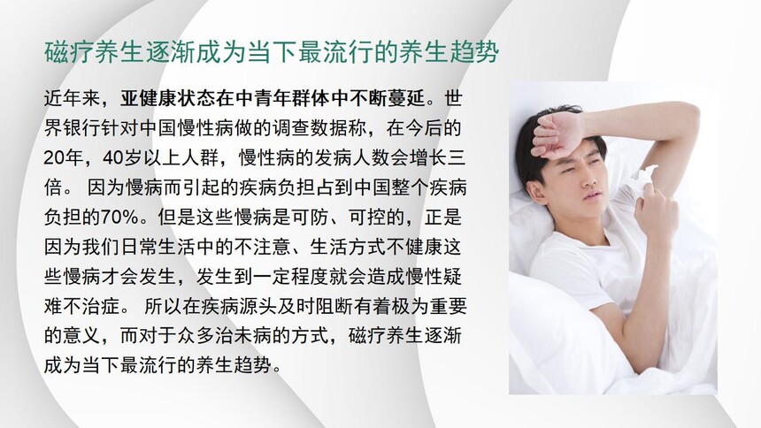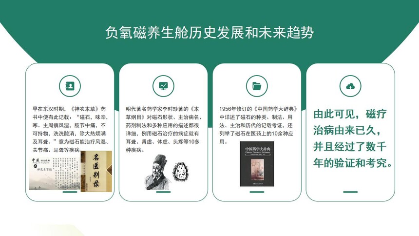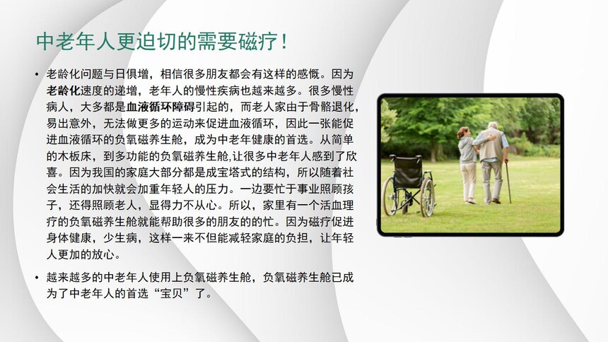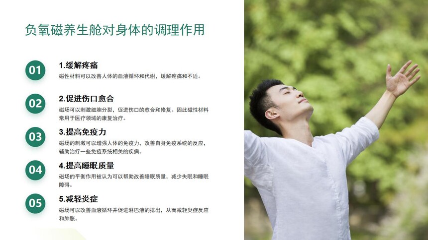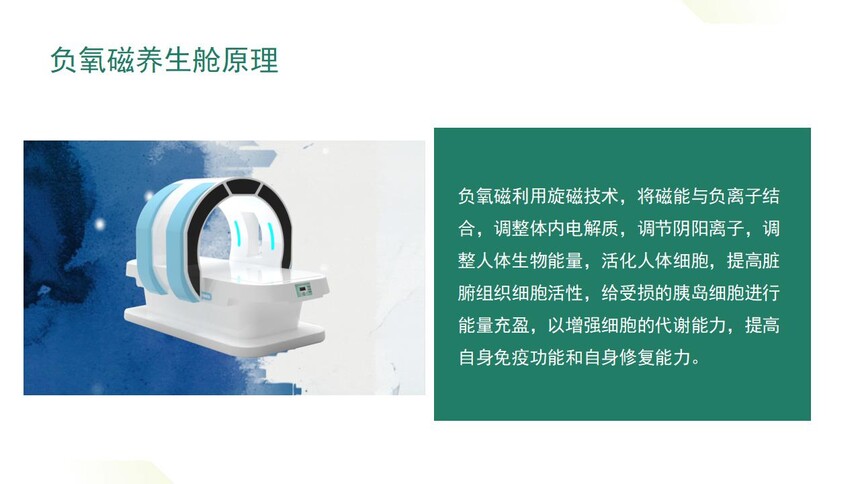 负氧磁养生舱负氧磁养生舱,旋磁就是旋转的恒定磁场。其磁场的强弱和方向会随时间而发生变化。 磁场作用人体主要是通过磁力线穿透人体作用于细胞产生感应电流,从而产生生物效应。旋磁一旦旋转起来,它的作用面积会扩大,通过公式计算,它的影响范围比静磁大8倍。同样,旋转磁场中的磁场是一个非常均匀的非常恒定的磁场,能在不对人体造成任何损伤的情况下,对人体的起到治疗和保健的作用。 ![]()