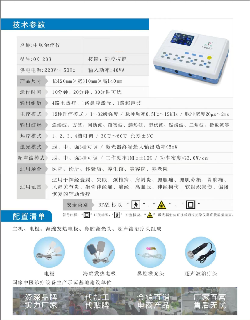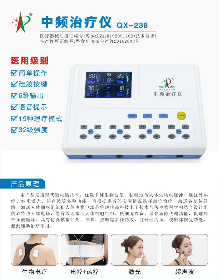 中频治疗仪QX-238,本产品采用现代微电脑技术,优选多种生物波型,独特地仿人体生物电脉冲、远红外热疗、纳米激光、超声波等多种功能,可根据患者的实际情况选择部位治疗,疏通各部位经络,激活人体细胞组织仿人体生物电场是将现代高科技电子技术与仿生物科学相结合设计出的独特仿人体电场,能有效地激活人体细胞组织、使细胞兴奋,增强新陈代谢功能,促进局部血液循环。具有仿真模拟针灸、推拿、按摩等多种功效,能舒经活血,使肌体恢复功能,起到辅助治疗作用。 |