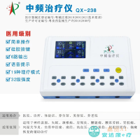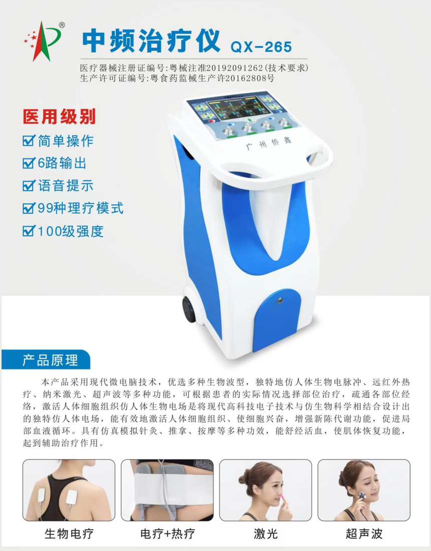 中频治疗仪 QX-265中频治疗仪QX-265,本产品采用现代微电脑技术,优选多种生物波型,独特地仿人体生物电脉冲、远红外热疗、纳米激光、超声波等多种功能,可根据患者的实际情况选择部位治疗,疏通各部位经络,激活人体细胞组织仿人体生物电场是将现代高科技电子技术与仿生物科学相结合设计出的独特仿人体电场,能有效地激活人体细胞组织、使细胞兴奋,增强新陈代谢功能,促进局部血液循环。具有仿真模拟针灸、推拿、按摩等多种功效,能舒经活血,使肌体恢复功能,起到辅助治疗作用。 ![]()