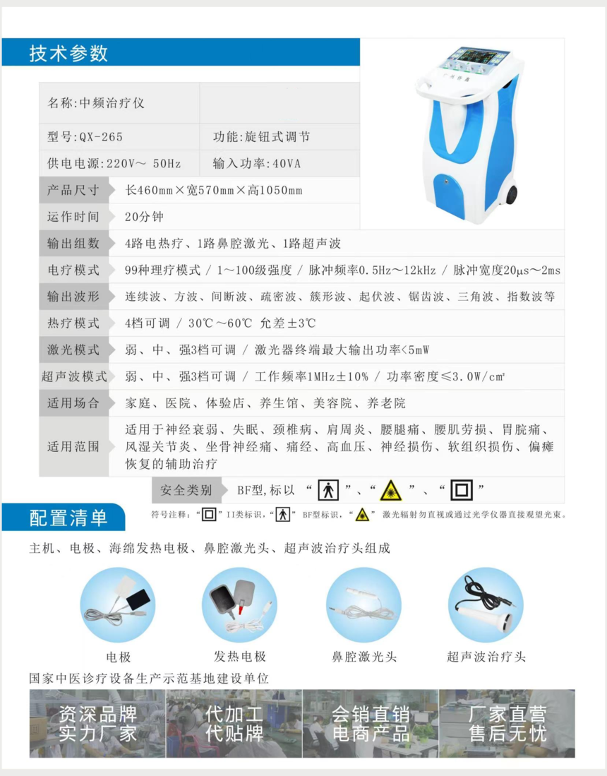 中频治疗仪QX-265,本产品采用现代微电脑技术,优选多种生物波型,独特地仿人体生物电脉冲、远红外热疗、纳米激光、超声波等多种功能,可根据患者的实际情况选择部位治疗,疏通各部位经络,激活人体细胞组织仿人体生物电场是将现代高科技电子技术与仿生物科学相结合设计出的独特仿人体电场,能有效地激活人体细胞组织、使细胞兴奋,增强新陈代谢功能,促进局部血液循环。具有仿真模拟针灸、推拿、按摩等多种功效,能舒经活血,使肌体恢复功能,起到辅助治疗作用。 |