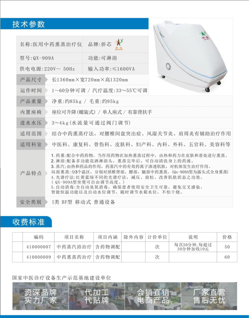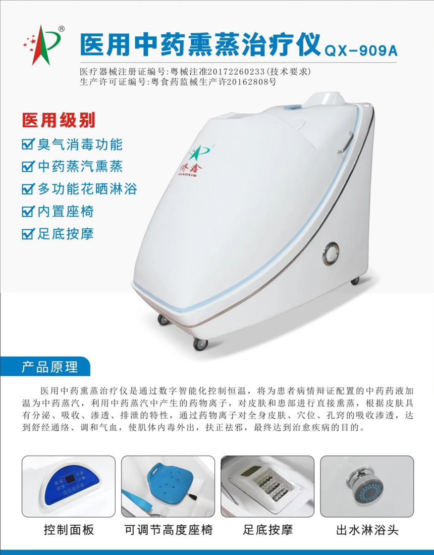 医用中药熏蒸治疗仪QX-909A,医用中药熏蒸治疗仪是通过数字智能化控制恒温,将为患者病情辩证配置的中药药液加温为中药蒸汽,利用中药蒸汽中产生的药物离子,对皮肤和患部进行直接熏蒸,根据皮肤具有分泌、吸收、渗透、排泄的特性,通过药物离子对全身皮肤、穴位、孔窍的吸收渗透,达到舒经通络、调和气血,使肌体内毒外出,扶正祛邪,最终达到治愈疾病的目的。 |