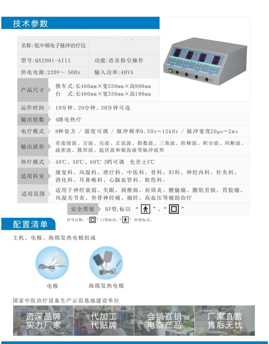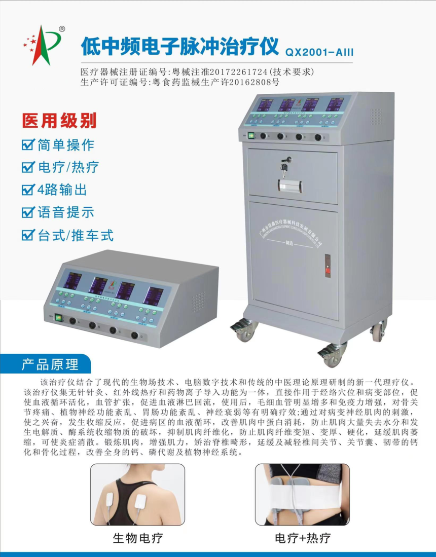 低中频电子脉冲治疗仪 QX2001-AII1低中频电子脉冲治疗仪QX2001-AII1,该治疗仪结合了现代的生物场技术、电脑数字技术和传统的中医理论原理研制的新一代理疗仪。该治疗仪集无针针灸、红外线热疗和药物离子导入功能为一体,直接作用于经络穴位和病变部位,促使血液循环活化,血管扩张,促进血液淋巴回流,使用后,毛细血管明显增多和免疫力增强,对骨关节疼痛、植物神经功能紊乱、胃肠功能紊乱、神经衰弱等有明确疗效;通过对病变神经肌肉的刺激,使之兴奋,发生收缩反应,促进病区的血液循环,改善肌肉中蛋白消耗,防止肌肉大量失去水分和发生电解质、酶系统收缩物质的破坏,抑制肌肉纤维化,防止肌肉纤维变短、变厚、硬化,延缓肌肉萎缩,可使炎症消散。锻炼肌肉,增强肌力,矫治脊椎畸形,延缓及减轻椎间关节、关节囊、韧带的钙化和骨化过程,改善全身的钙、磷代谢及植物神经系统。 ![]()