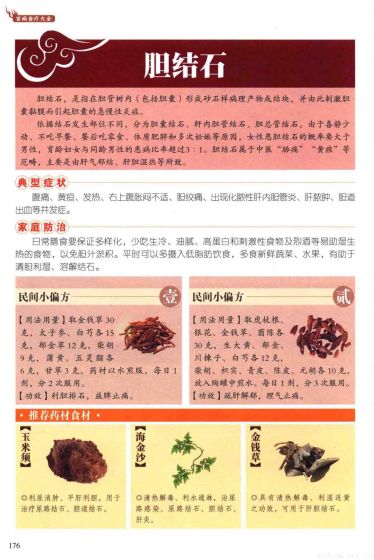 胆结石:胆结石,是指在胆管树内(包括胆囊)形成砂石样病理产物或结块,并由此刺激胆囊黏膜而引起胆囊的急慢性炎症。依据结石发生部位不同,分为胆袁结石、肝内胆管结石、胆总管结石。由于喜静少动、不吃早餐、餐后吃零食、体质肥胖和多次妊娠等原因,女性患胆结石的概率要大于男性,育龄妇女与同龄男性的患病比率超过3:1。胆结石属于中医“胁痛”“黄疸”等范畴,主要是由肝气郁结、肝胆湿热等所致。 典型症状:腹痛、黄疸、发热、右上腹胀闷不适、胆绞痛、出现化脓性肝内胆管炎、肝脓肿、胆道出血等并发症。 家庭 防治:日常膳食要保证多样化,少吃生冷、油腻、高蛋白和刺激性食物及烈酒等易助湿生热的食物,以免胆汁淤积。平时可以多摄入低脂肪饮食,多食新鲜蔬菜、水果,有助于清胆利湿、溶解结石。