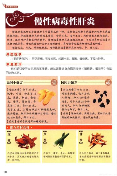 慢性病毒性肝炎:慢性病毒性肝炎是慢性肝炎中最常见的一种,主要由乙型肝炎病毒和丙型肝炎病毒感染所致。导致慢性肝炎的原因主要是:营养不良、治疗不当、同时患有其他传染病、饮酒、服用对肝有损害的药物等。慢性病毒性肝炎患者抽血化验,可发现有肝炎病毒以及肝功能异常。慢性病毒性肝炎如不及时治疗,有可能会发展为肝硬化甚至肝癌。根据炎症、坏死、纤维化程度,可将慢性病毒性肝炎分为轻、中、重三型。 典型症状 家庭防治:主要症状有乏力、肝区疼痛、毛发脱落、齿龈出血、腹胀、蜘蛛痣、下肢水肿等。有机硒可使肝炎的发病率降低,所以适量进食含硒的食物(如蘑菇、蛋类等)有助于防治本病。