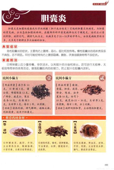 胆囊炎:胆囊炎是细菌性感染或化学性刺激(胆汁成分改变)引起的胆囊炎性病变,为胆囊的常见病,分为急性和慢性两种,在腹部外科中其发病率仅次于阑尾炎。治疗应以清利肝胆、疏肝行气、调理气机为主。本病多见于35~55岁的中年人,女性发病较男性为多,尤多见于肥胖且多次妊娠的妇女。 典型症状:急性胆囊炎的症状,主要有右上腹疼、恶心、呕吐和发热等。慢性胆囊炎的临床表现多不典型,亦不明显。平时可能经常有右上腹部隐痛、腹胀、厌食油腻食物等不良症状。 家庭防治:日常保健上应少量多餐,多饮汤水,以利胆汁的分泌和排出,还可进行太极拳、太极剑等简单的体育活动,增强胆囊肌肉的收缩力,防止胆汁在胆囊内淤积。