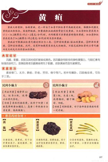黄 疸:黄疸又称黄胆,俗称黄病,是一种由于血清中胆红素升高致使皮肤、黏膜和巩膜发黄的症状和体征。某些肝脏病、胆囊病和血液病经常会引发黄疸。当血清胆红素浓度为17.1~34.2微摩尔/升(1~2毫克/分升)时,而肉眼看不出黄疸者称隐性黄疸。如血清胆红素浓度高于34.2微摩尔/升(2毫克/分升)时则为显性黄疸。黄疸症可根据血红素代谢过程分为三类:①肝前性黄疸/溶血性黄疸。②肝源性黄疸。③肝后性黄疸。此外,还有肝细胞有某些先天性缺陷,不能完成胆红素的正常代谢而发生的先天性非溶血性黄疸。 典型症状:巩膜、黏膜、皮肤及其他组织被染成黄色。因巩膜含有较多的弹性硬蛋白,与胆红素有较强的亲和力,故黄疸患者巩膜黄染常先于黏膜、皮肤黄染而首先被察觉。 家庭 防治:揉按章门、太冲、脾俞、肝俞、劳宫、脊中等穴。若伴有嗜卧、四肢倦怠者,可灸手三里。