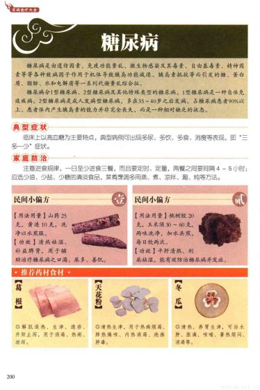 糖尿病:糖尿病是由遗传因素、免疫功能紊乱、微生物感染及其毒素、自由基毒素、精神因素等等各种致病因子作用于机体导致胰岛功能减退、胰岛素抵抗等而引发的糖、蛋白质、脂肪、水和电解质等一系列代谢紊乱综合征。糖尿病分1型糖尿病、2型糖尿病及其他特殊类型的糖尿病。1型糖尿病是一种自体免疫疾病。2型糖尿病是成人发病型糖尿病,多在35~40岁之后发病,占糖尿病患者90上。患者体内产生胰岛素的能力并非完全丧失,而是一种相对缺乏的状态。 典型症状:临床上以高血糖为主要特点,典型病例可出现多尿、多饮、多食、消瘦等表现,即“三多一少”症状。 家庭防治:注意进食规律,一日至少进食三餐,而且要定时、定量,两餐之间要间隔4~5小时;应选少油、少盐、少糖的清淡食品,菜肴烹调多用蒸、煮、凉拌、涮、炖等方法。
