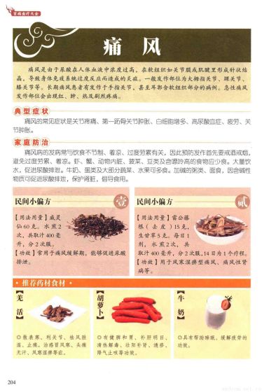 痛 风:痛风是由于尿酸在人体血液中浓度过高,在软组织如关节膜或肌腱里形成针状结晶,导致身体免疫系统过度反应而造成的炎症。一般发作部位为大拇指关节、踝关节、膝关节等。长期痛风患者有发作于手指关节,甚至耳郭含软组织部分的病例。急性痛风发作部位会出现红、肿、热及剧烈疼痛。 典型症状:痛风的常见症状是关节疼痛、第一跖骨关节肿胀、白细胞增多、高尿酸血症、疲劳、关节肿胀。 家庭 防治:痛风病的发病常与饮食不节制、着凉、过度劳累有关,因此预防发作首先要戒酒戒烟,避免过度劳累、着凉。虾、蟹、动物内脏、菠菜、豆类及含嘌呤高的食物应少食。大量饮水,促进尿酸排泄。牛奶、蛋类及大部分蔬菜、水果可多食。加碱的粥类、面食,因含碱性物质可促进尿酸排泄,保护肾脏,倡导食用。