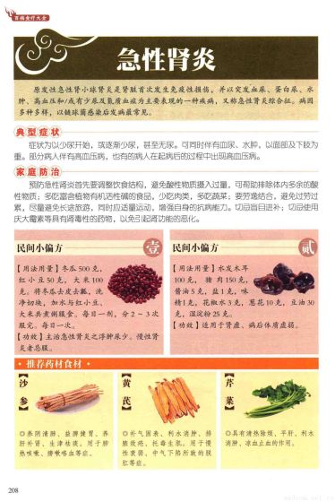 急性肾炎:原发性急性肾小球肾炎是肾脏首次发生免疫性损伤,并以突发血尿、蛋白尿、水肿、高血压和/或有少尿及氮质血症为主要表现的一种疾病,又称急性肾炎综合征。病因多种多样,以链球菌感染后发病最常见。 典型症状:症状为以少尿开始,或逐渐少尿,甚至无尿。可同时伴有血尿、水肿,以面部及下肢为重。部分病人伴有高血压病,也有的病人在起病后的过程中出现高血压病。 家庭防治:预防急性肾炎首先要调整饮食结构,避免酸性物质摄入过量,可帮助排除体内多余的酸性物质;多吃富含植物有机活性碱的食品,少吃肉类,多吃蔬菜;要劳逸结合,避免过劳过累,尽量避免长途旅游,同时应适量运动,增强自身的抗病能力。切忌盲目进补;切忌使用庆大霉素等具有肾毒性的药物,以免引起肾功能的恶化。