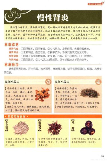 慢性肾炎:慢性肾小球肾炎,简称慢性肾炎,是一种链球菌感染的变态反应性疾病。慢性肾炎发病少数为急性肾炎迁延不愈所致,绝大多数起病即为慢性。慢性肾炎临床主要表现有水肿、高血压、蛋白尿和血尿等症状,由于病理改变各种各样,症状表现不一样。严重者可能出现尿毒症。其以男性患者居多,病程持续1年以上,发病年龄大多在20~40岁。 家庭防治 肺肾气虚:①面浮肢肿,面色萎黄。②少气无力。③易感冒。④腰脊酸痛等。 脾肾阳虚:①水肿明显,面色苍白。②畏寒肢冷。③脉沉细或沉迟无力等。 肝肾阴虚:①目睛干涩或视物模糊。②头晕、耳鸣。③五心烦热,□干咽燥等。 气阴两虚:①面色无华。②少气乏力或易感冒。③午后低热或手足心热等。 避免阴雨天外出、汗出当风、涉水冒雨、穿潮湿衣服;给予优质低蛋白、低磷、高维生素饮食。