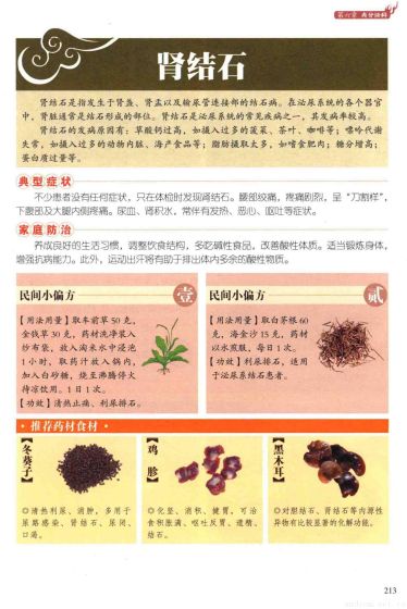 肾结石:肾结石是指发生于肾盏、肾盂以及输尿管连接部的结石病。在泌尿系统的各个器官中,肾脏通常是结石形成的部位。肾结石是泌尿系统的常见疾病之一,其发病率较高。 肾结石的发病原因有:草酸钙过高,如摄入过多的菠菜、茶叶、咖啡等;嘌呤代谢失常,如摄入过多的动物内脏、海产食品等;脂肪摄取太多,如嗜食肥肉;糖分增高;蛋白质过量等。 典型症状:不少患者没有任何症状,只在体检时发现肾结石。腰部绞痛,疼痛剧烈,呈“刀割样”,下腹部及大腿内侧疼痛。尿血、肾积水,常伴有发热、恶心、呕吐等症状。 家庭防治:养成良好的生活习惯,调整饮食结构,多吃碱性食品,改善酸性体质。适当锻炼身体,增强抗病能力。此外,运动出汗将有助于排出体内多余的酸性物质。