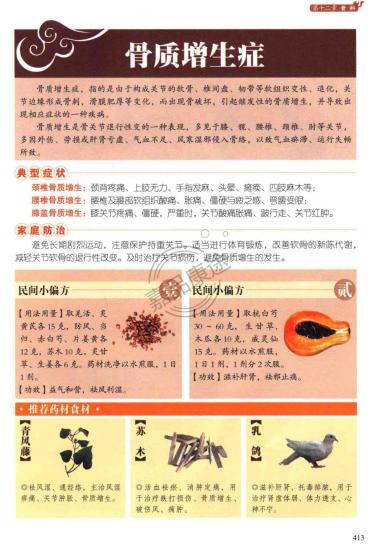 骨质增生症:骨质增生症,指的是由于构成关节的软骨、椎间盘、韧带等软组织变性、退化,关节边缘形成骨刺,滑膜肥厚等变化,而出现骨破坏,引起继发性的骨质增生,并导致出现相应症状的一种疾病。 骨质增生是骨关节退行性变的一种表现,多见于膝、髋、腰椎、颈椎、肘等关节,多因外伤、劳损或肝肾亏虚、气血不足、风寒湿邪侵入骨络,以致气血瘀滞、运行失畅所致。 典型症状:颈椎骨质增生:颈背疼痛、上肢无力、手指发麻、头晕、瘫痪、四肢麻木等;腰椎骨质增生:腰椎及腰部软组织酸痛、胀痛、僵硬与疲乏感、弯腰受限;膝盖骨质增生:膝关节疼痛、僵硬,严重时,关节酸痛胀痛、跛行走、关节红肿。 家庭防治:避免长期剧烈运动,注意保护持重关节。适当进行体育锻炼,改善软骨的新陈代谢,减轻关节软骨的退行性改变。及时治疗关节损伤,避免骨质增生的发生。 推荐药材食材:【青风藤】 【苏木】 【乳鸽】补骨脂芡实鸭汤,玉竹西洋参茶,海带豆腐汤