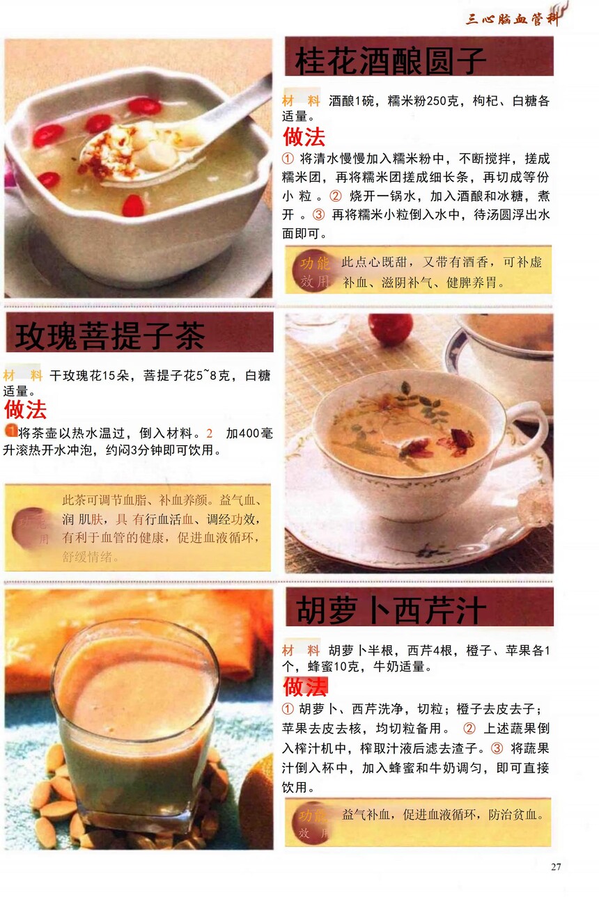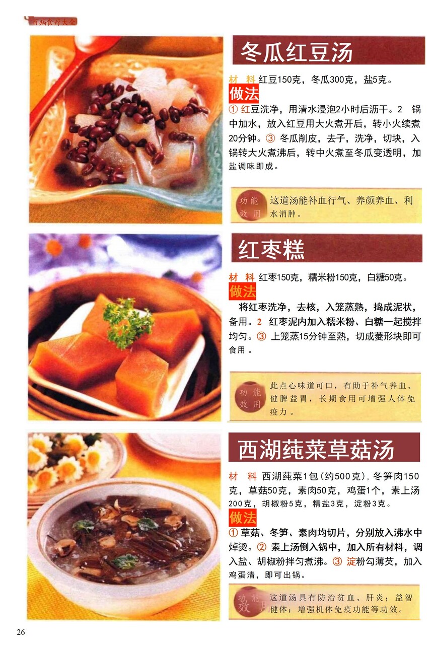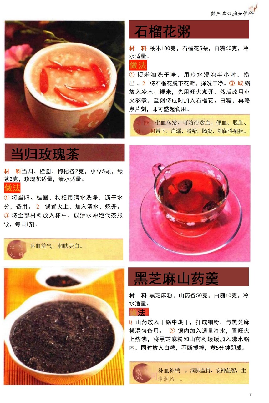 白果冬瓜汤,石榴花粥,当归玫瑰茶,黑芝麻山药羹,香菇白菜羹,红枣连子鸡腿汤